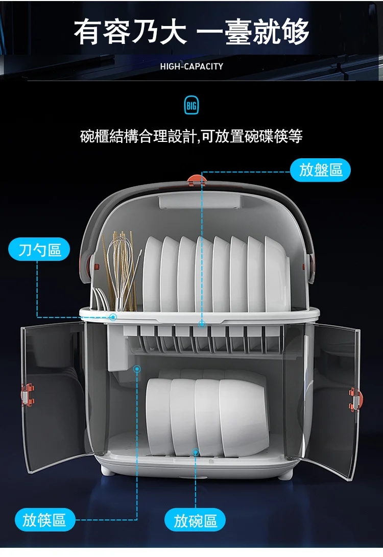 11分鐘前智能家用碗碟收納瀝水紫外線消毒密封雙層碗櫃 - 一入組NT$1398 NT$ 1398