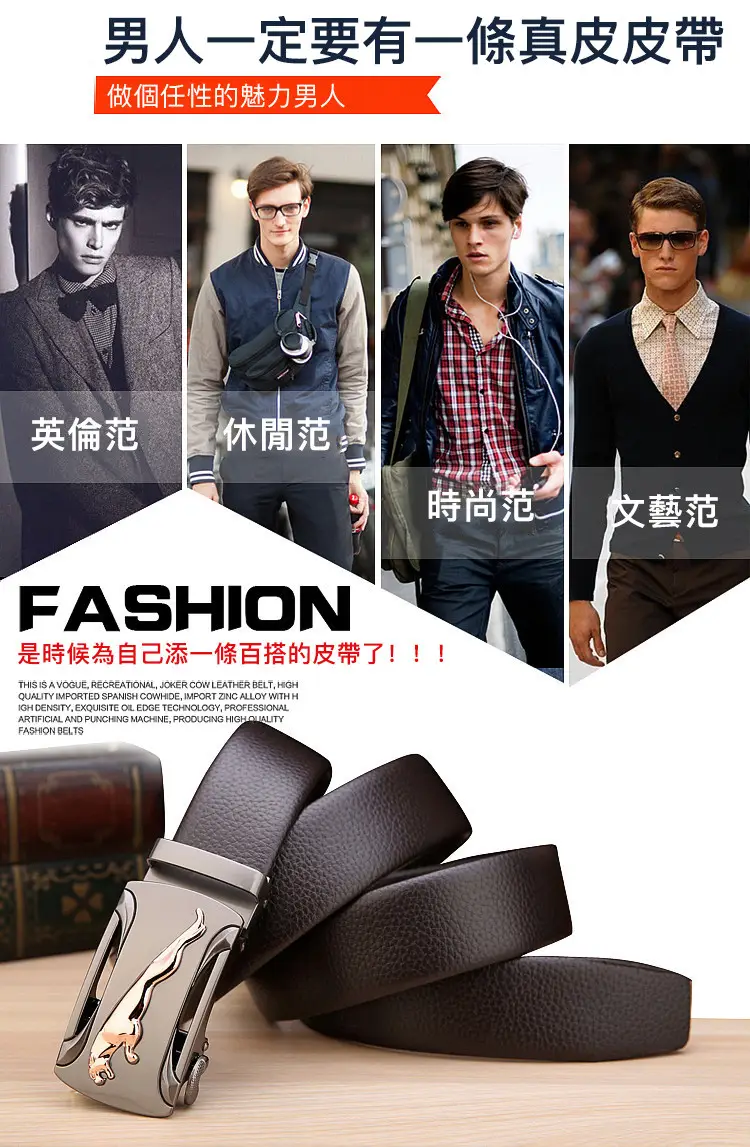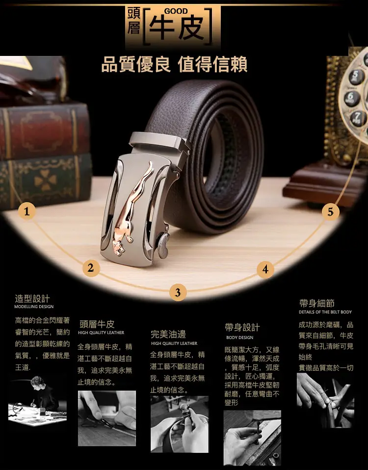 20分鐘前【官方站】男士獵豹自動扣真皮腰帶 【能用十年的真皮腰帶】 整張牛皮裁剪打造,純手工製作,耐磨耐折耐用,品質高端,彰顯男士成熟魅力