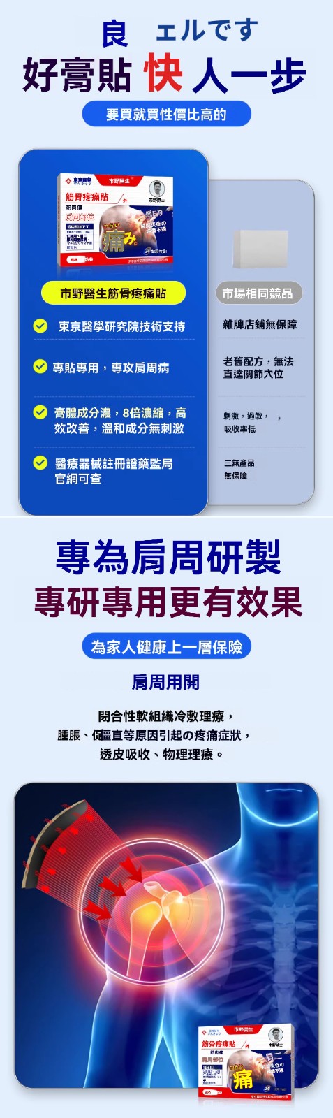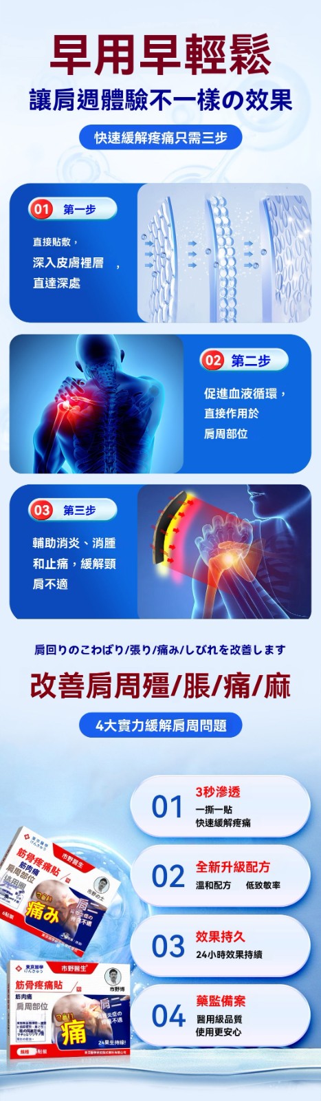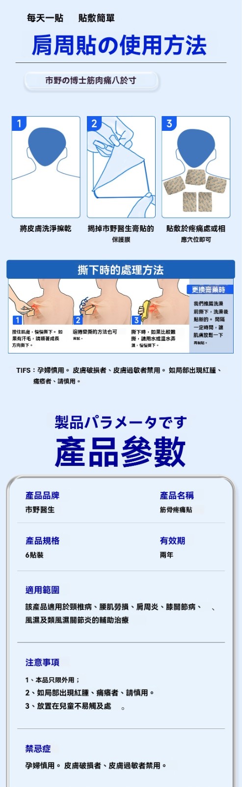 半小時前市野醫生緩解關節疼痛肩周貼,多種原材合理搭配製成,柔軟貼合,長時貼敷、深入肌膚呵護,早用早好。 - 【三療程 行走順暢不再疼痛】買三送四-NT$1400