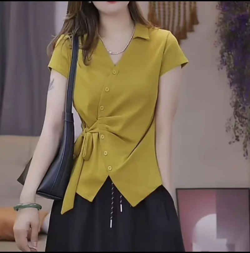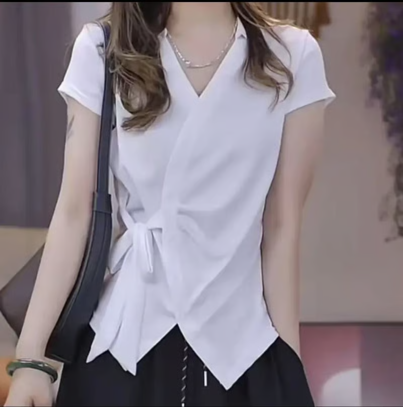 25分鐘前夏季新款重工不規則設計短袖時尚綁帶V領T恤女修身顯瘦上衣女 - 【均價699】到手2件-NT$1399