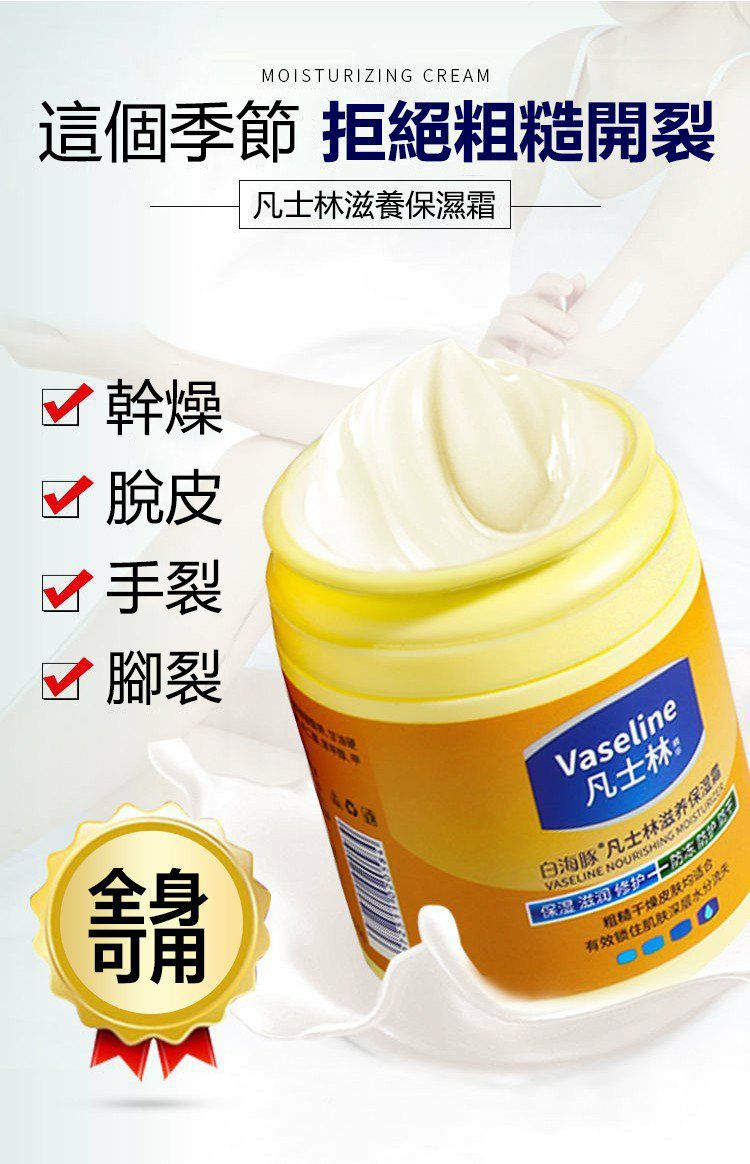7分鐘前醫師推薦【凡士林滋潤補水保濕霜】#買三送二 到手五盒 一抹即潤 瞬間吸收!保濕修護 清爽不油膩 全身都能用。可以當面霜,護手霜,身體乳使用 - 【買三送二】到手5瓶-NT$899